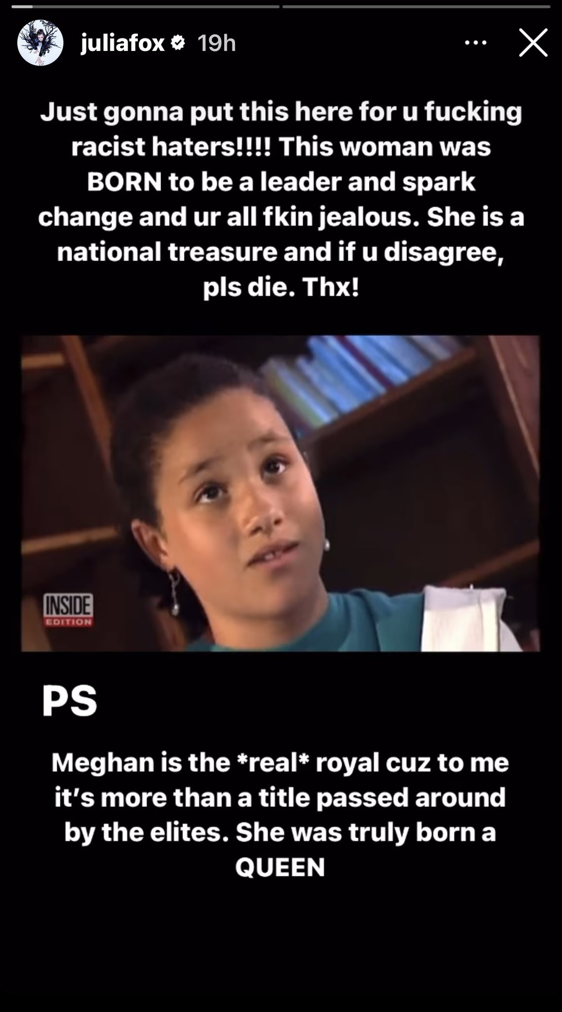 她進一步說,不是宮裡的人,而是梅根·馬克爾才是“真正的王室成員”。福克斯繼續打擊“種族主義(咒罵)仇恨者,稱這位(梅根·馬克爾)女性天生就是領導者並引髮變革”。