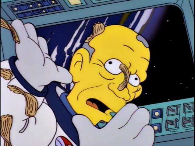 Med alt, hvad Buzz Aldrin har gjort i sin livet, er jeg sikker på, at han ville overveje at give udtryk for sig selv i The Simpsons ret højt oppe. Et andet indlæg fra sæson fem,”Deep Space Homer”, har Homer, der søger (og på en eller anden måde har succes) for at blive astronaut sammen med en kortvarig ædru Barney. Når man først er i rummet, på typisk Homer-manér, begynder tingene at optrevle meget til ærgrelse for Buzz, og vi bliver forkælet med’den’scene, hvor Homer spiser sig igennem kartoffelchips, mens han flyder.