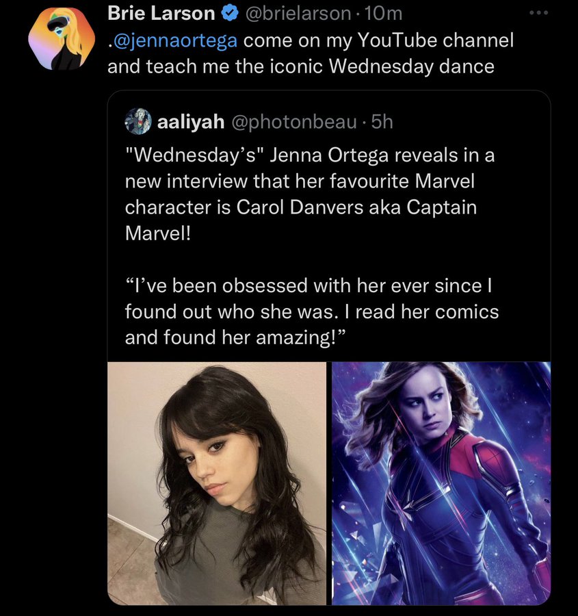 ブリー・ラーソンは、新しい水曜日のスター、ジェナ・オルテガに関する虚偽のツイートの餌食になりました.ハリウッドスターは、ソーシャルメディアサイトに浮かぶすべてのミームとトレンドに追いつくことが確かに欠けています.そのような事件の 1 つは、偽の Twitter ユーザーが、ジェナ・オルテガがキャプテン・マーベルを彼女のお気に入りのスーパーヒーロー キャラクターと考えているとツイートしたときでした。