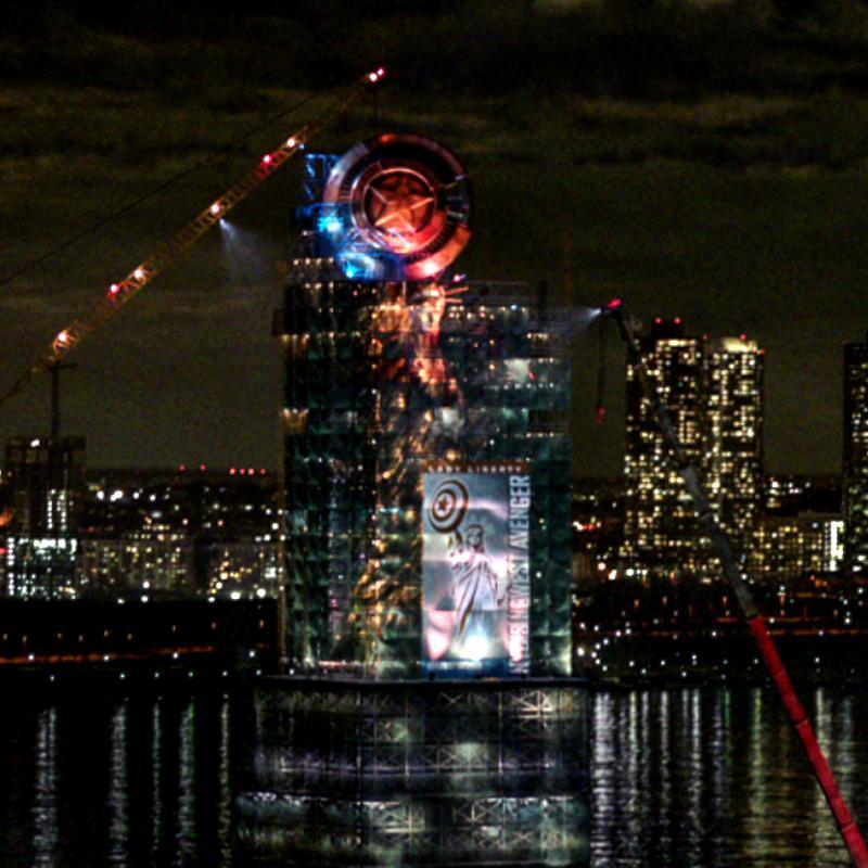 初期のデザインでは、自由の女神がキャプテンアメリカの盾を持っていますが、上部に周囲の足場がありません: