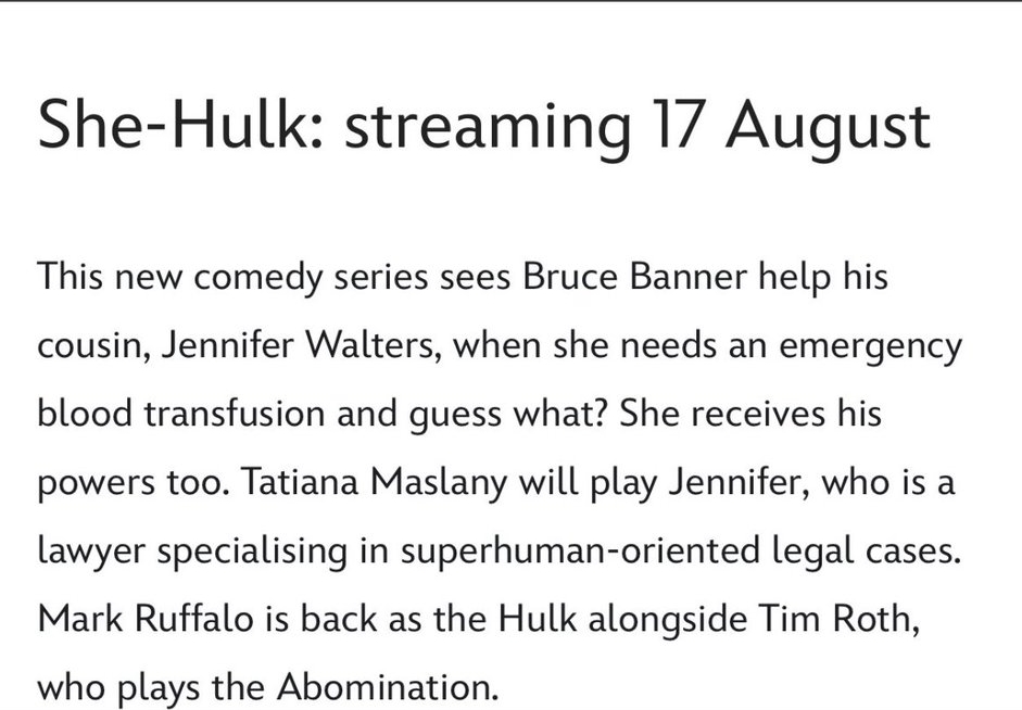 the upHvelk>Shh. serialet që do të dalin në Disney+. Ky serial do të bëjë një debutim të një superheroine të re që është She-Hulk e luajtur nga Tatiana Maslany. Në këtë serial, ne do të shohim gjithashtu Hulk të Mark Ruffalo dhe Abomination të Tim Roth. Ky serial ka disa probleme me publikimin pasi fansat spekuluan se do të publikohej pas serialit Moon Knight. Por ky serial shkoi në rixhirim dhe për këtë arsye, nuk erdhi pasi Moon Knight dhe CEO i Disney+ Bob Chapek konfirmuan se pas Moon Knight, Ms.Marvel do të publikohet. Në Ditën Ndërkombëtare të Gruas, u konfirmua që Ms.Marvel do të publikojë pas Moon Knight ndërsa publikojnë ngacmimin e Ms.Marvel. Tani Disney UK poston aksidentalisht datën e lëshimit të She-Hulk dhe do të publikohet më 17 gusht 2022. Në atë postim, Disney UK shkroi gjithashtu”Ky serial i ri komedi sheh Bruce Banner të ndihmojë kushërirën e tij, Jennifer Walters, kur ajo ka nevojë për një gjak urgjent transfuzion, dhe me mend çfarë? Ajo gjithashtu merr fuqitë e tij. Tatiana Maslany do të luajë rolin e Jennifer Walters, e cila është një avokate e specializuar në çështjet ligjore me orientim mbinjerëzor. Mark Ruffalo është rikthyer si Hulk, së bashku me Tim Roth, i cili luan rolin e neveritshëm”.