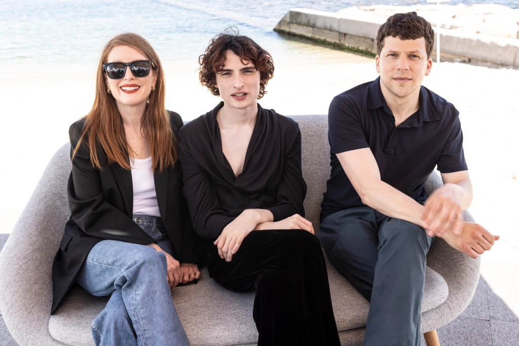 Jesse Eisenberg (längst till höger) tillsammans med huvudstjärnorna Finn Wolfhard (mitten) och Julianne Moore (vänster).