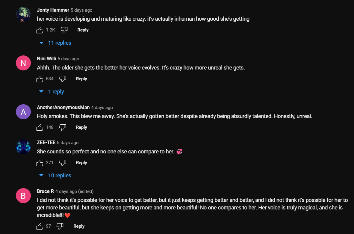 “Mga banal na usok. This blew me away. Siya ay talagang naging mas mahusay sa kabila ng pagiging walang katotohanan na talino. Sa totoo lang, hindi totoo,” sabi ng isa pang fan. Walang katapusang nagkokomento ang mga tagahanga kung gaano kaganda, parang panaginip, at hindi kapani-paniwala ang kanyang boses, at lalo siyang gumaganda sa tuwing maririnig namin siya.